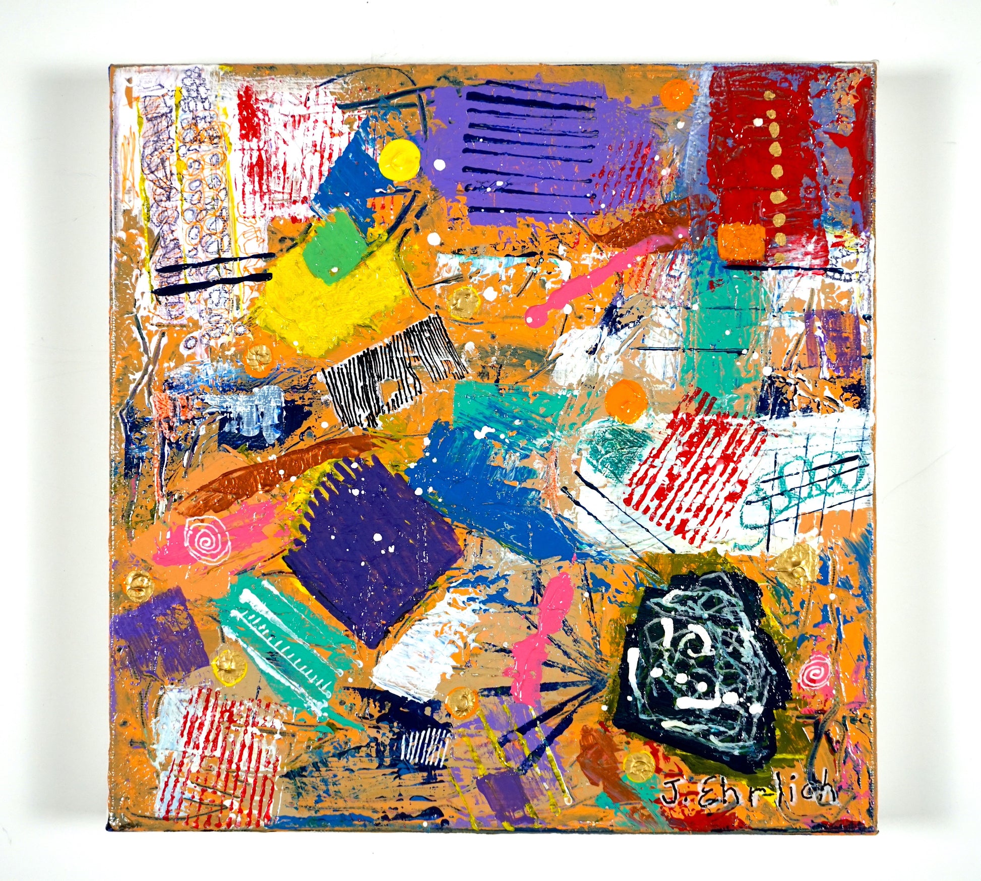 This 12"x12" canvas, stretched 1-1/2" deep and gallery wrapped with a sleek black floater frame, bursts with the vibrant hues of a fantasy fair. Filled with whimsical marks, lines, grids, and dots, it’s a cheerful piece designed to delight the eye and spark smiles. Brighten any room and charm your friends with this colorful artwork. Enjoy free shipping across the USA.