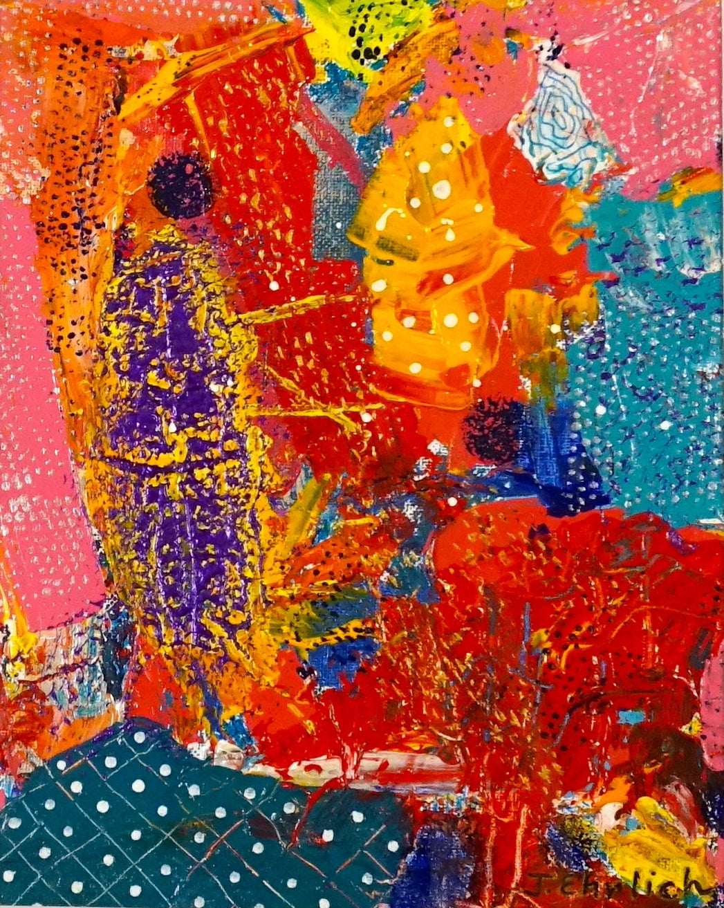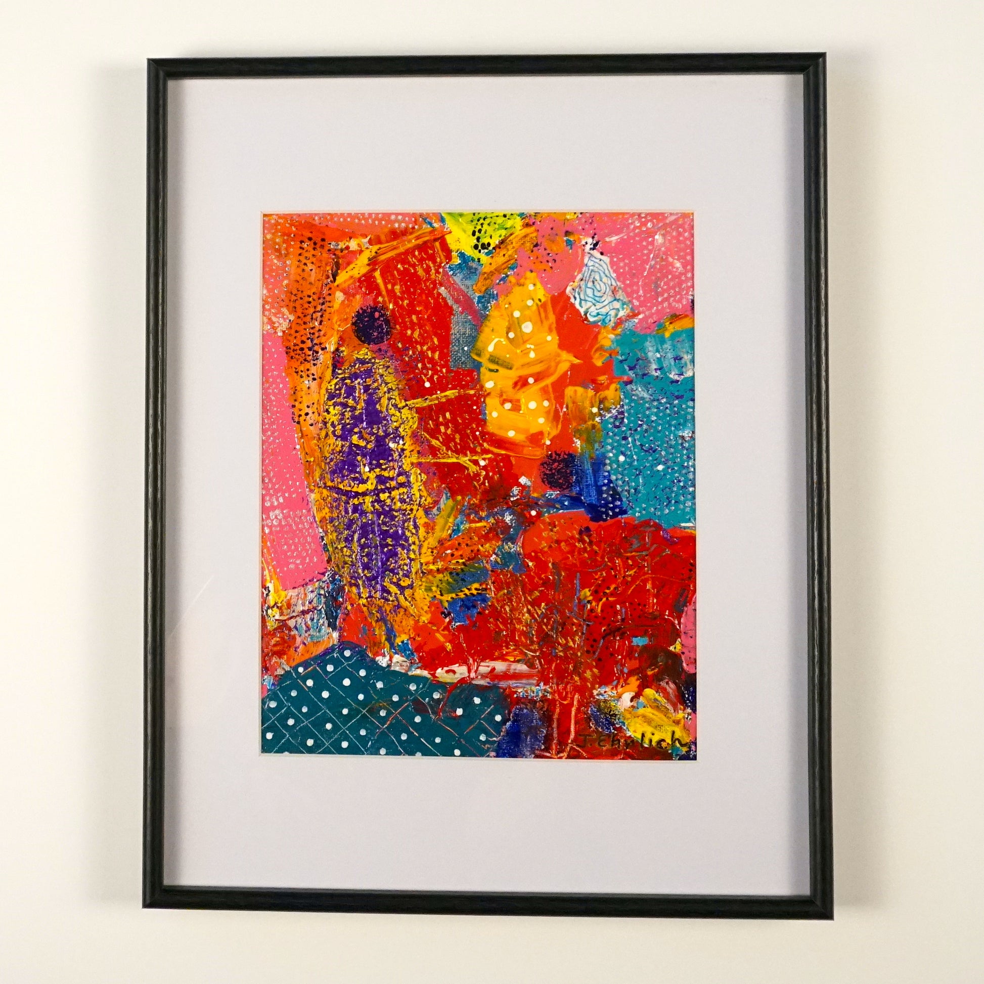 This 12"x15" artwork is framed with a mat and features rich acrylic colors layered with textured dots to create depth and visual complexity. Enjoy complimentary shipping across the USA with your purchase.