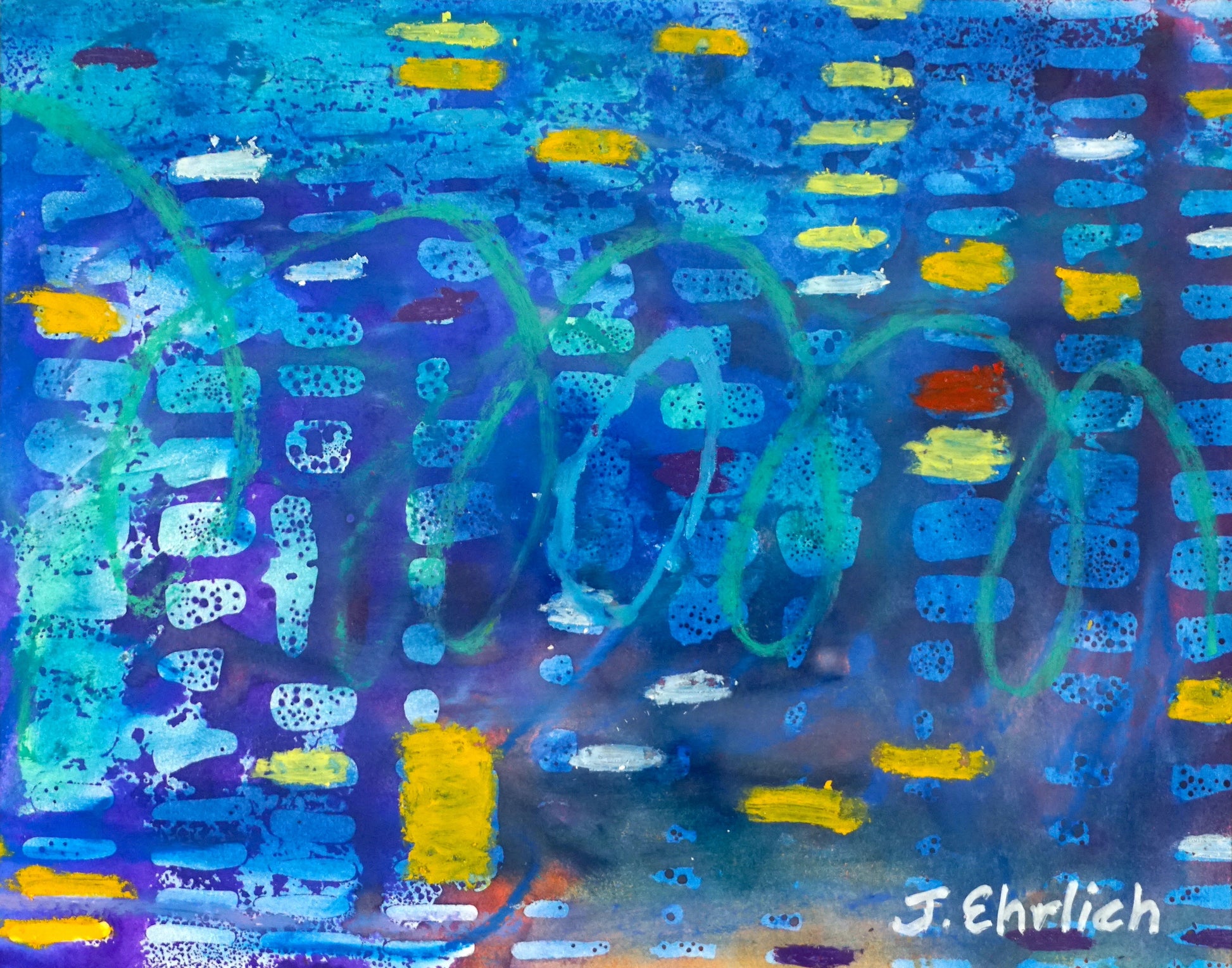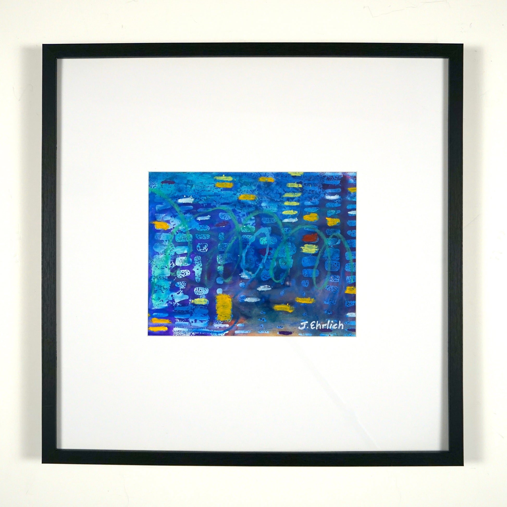 Measuring 19"x19", this piece is set in a simple black frame with mat. Delight in the soothing blues of acrylic paint, accented with melted oil pastel highlights. The design, vibrant colors and unique patterns truly pop. Enjoy free shipping across the USA!