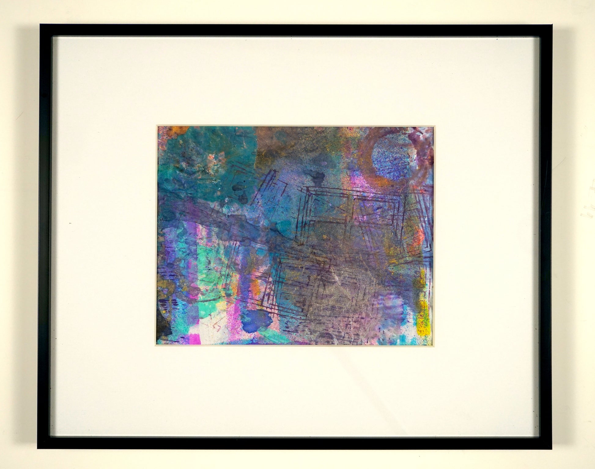 17"x15" matted and framed. So many points of interest in this painting. Acrylic colors leap off the palette paper it resides on. You'll find something new at every glance. Free shipping in USA.