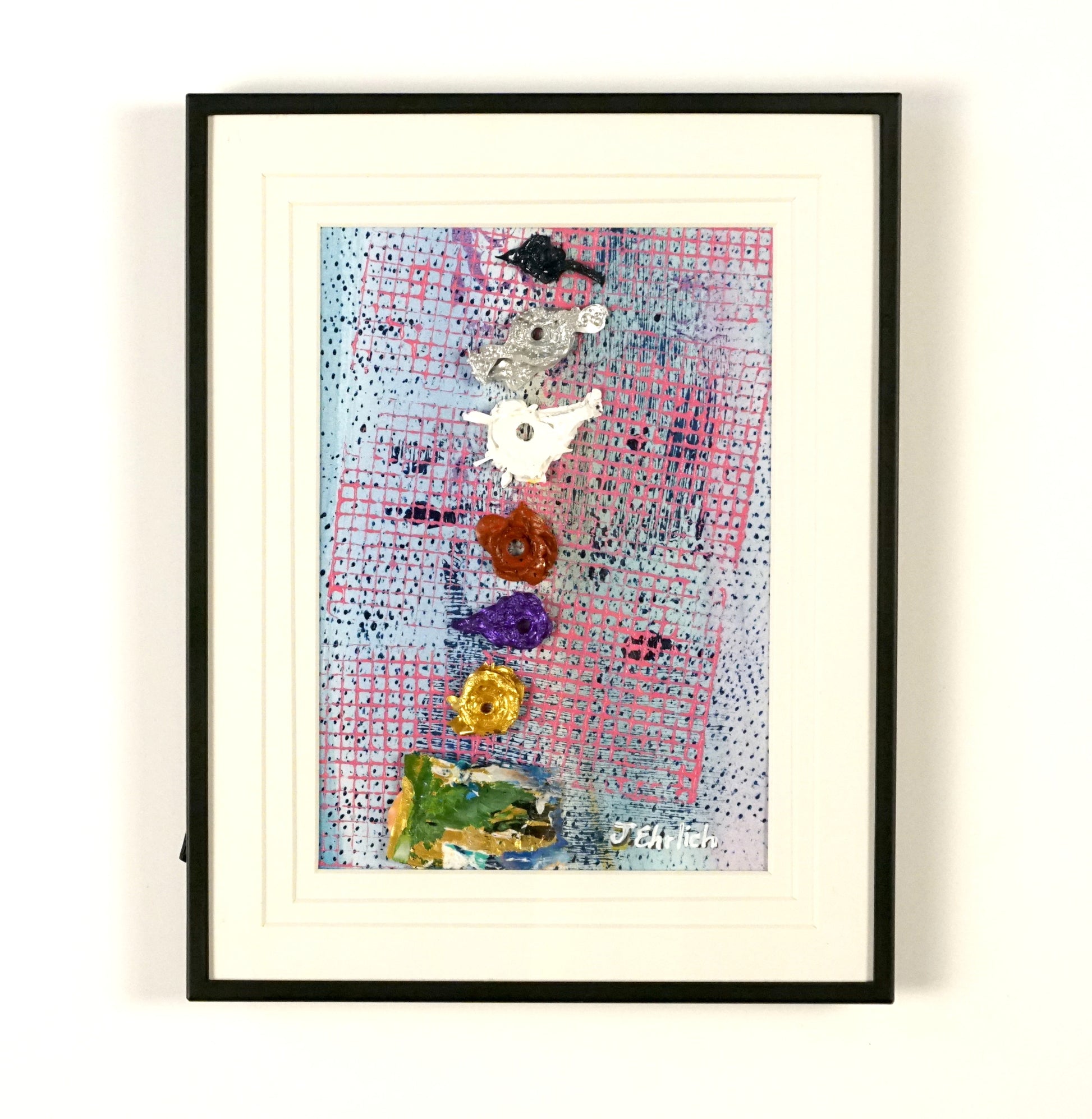 Measuring 7" x 9" and framed with a mat, this piece features authentic acrylic paint droplets on a textured surface. Its understated design carries a strong visual impact. Complimentary shipping available within the USA.