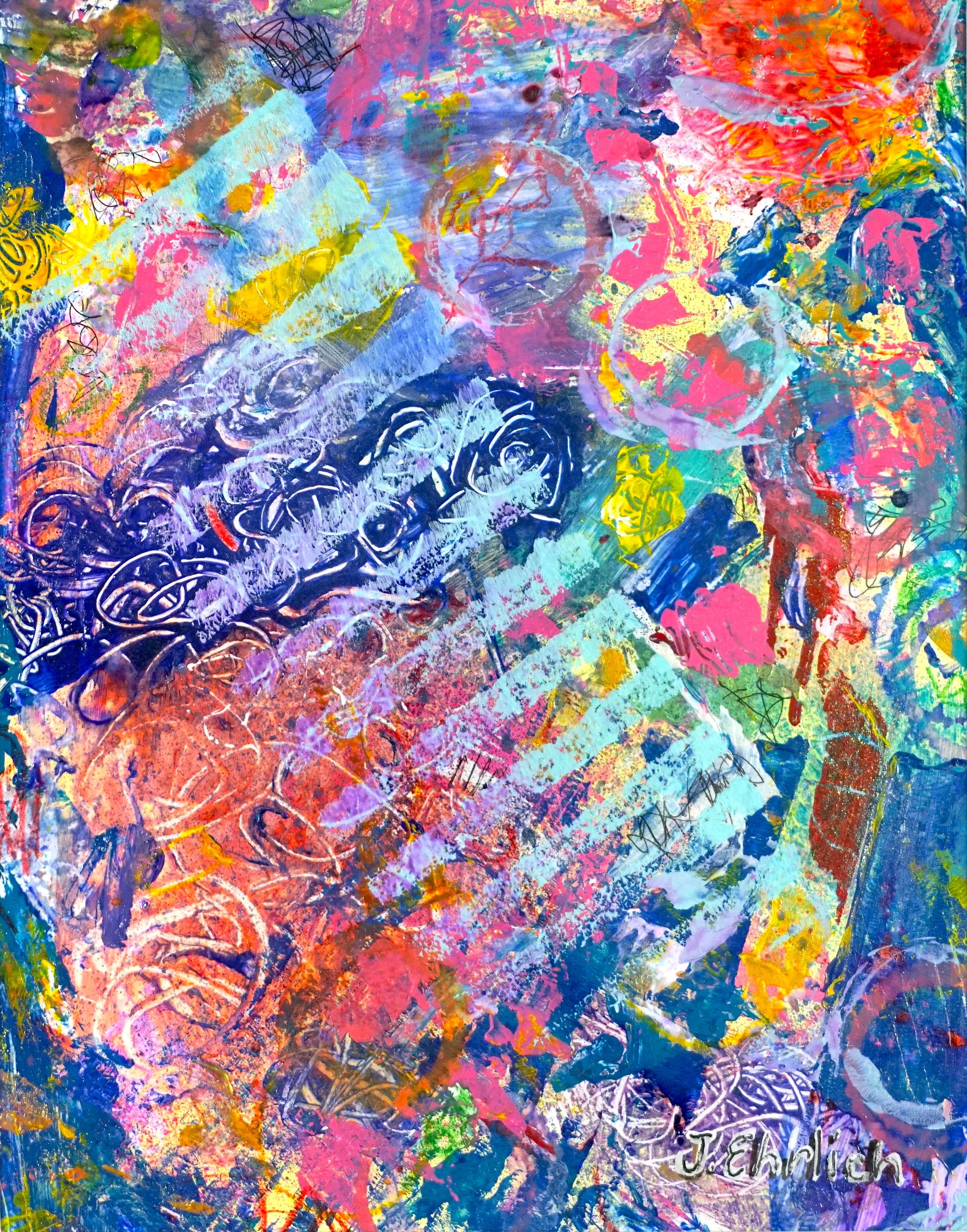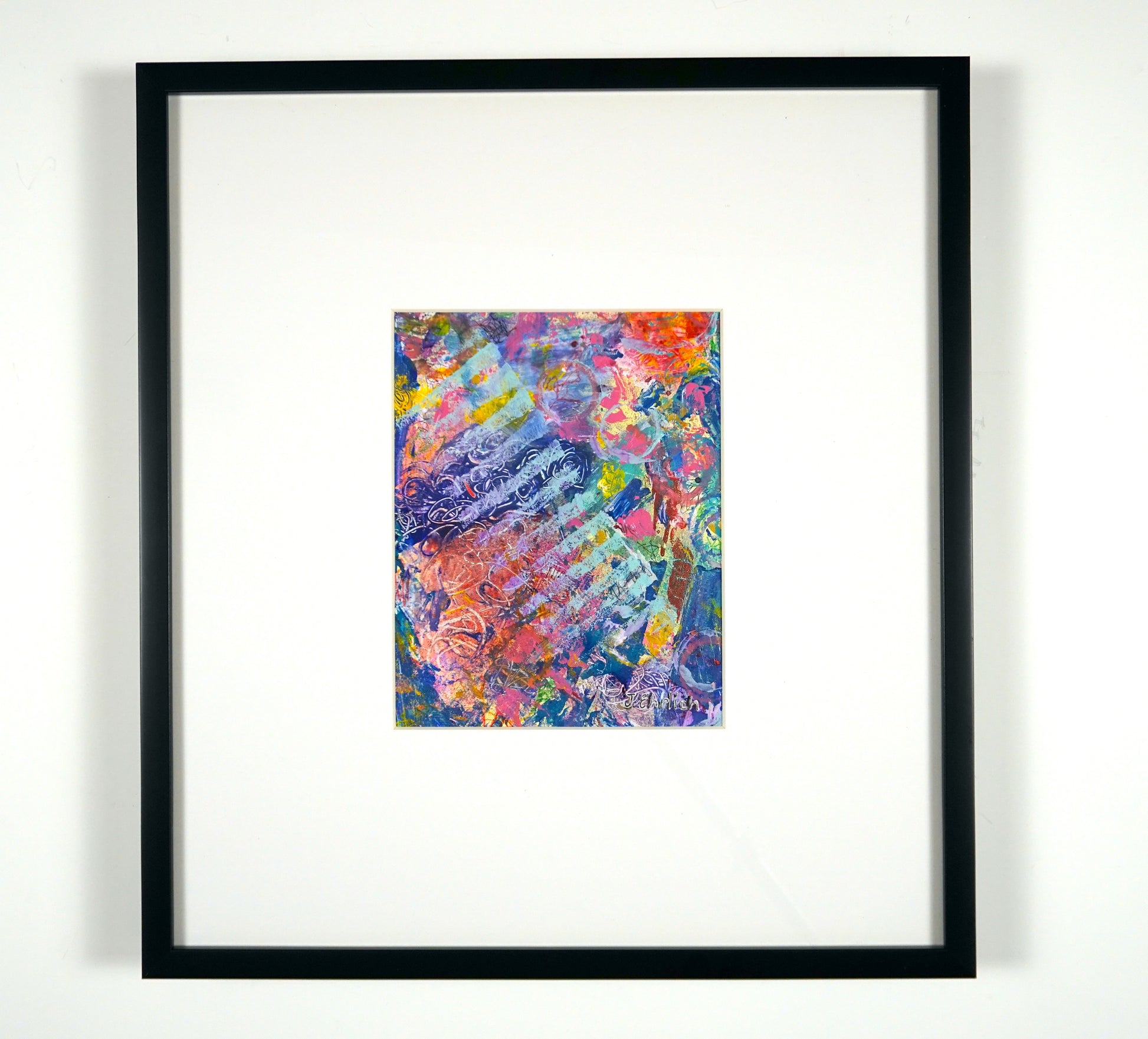 This 19"x21" framed and matted original painting explodes with vibrant acrylic colors and lively marks that invite your eye to explore every inch. Created on palette paper, its textures and style are truly captivating. Let your gaze catch the rhythm and pulse of this energetic piece. Free shipping across the USA!