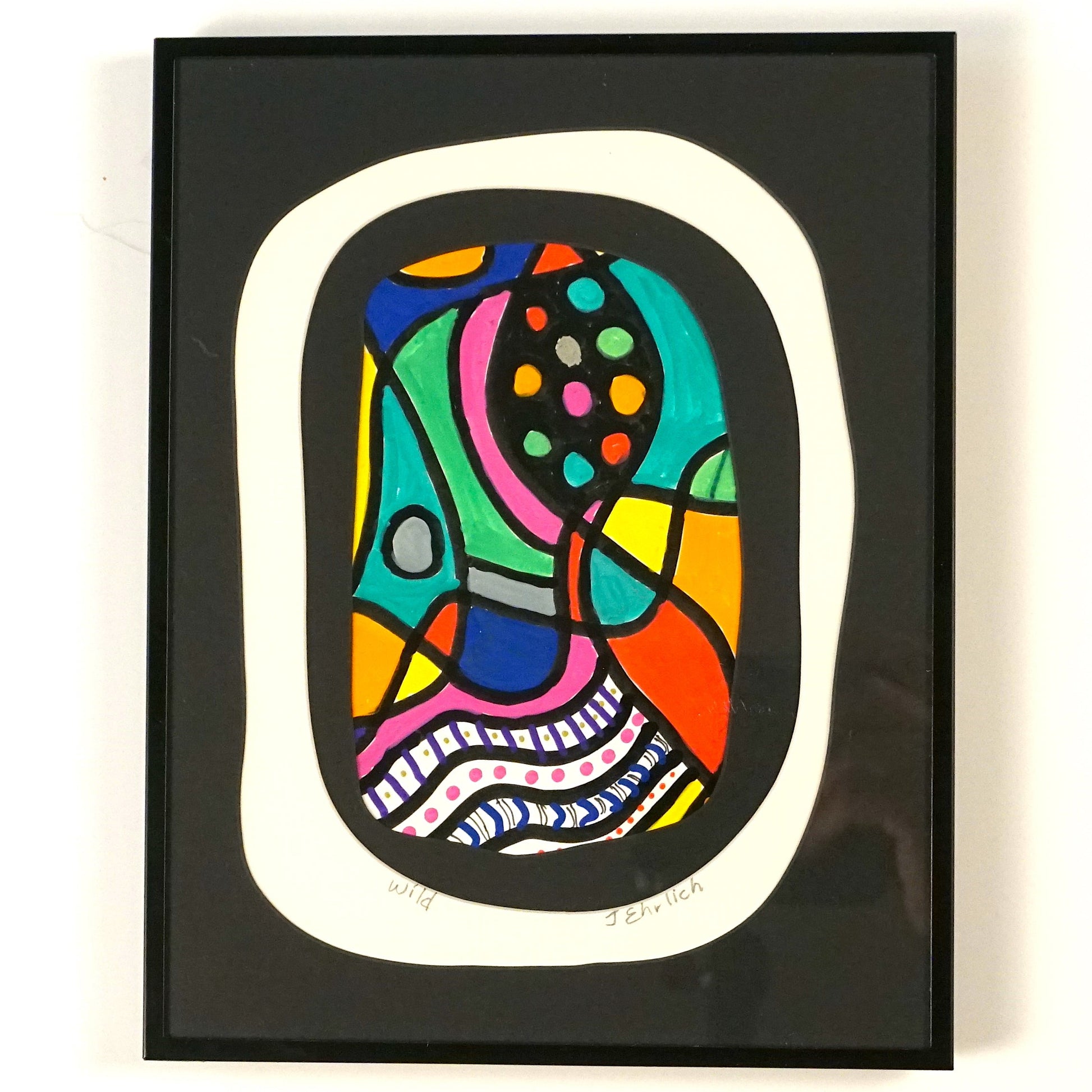 This 7"x9" small artwork features acrylic pen on paper, elegantly showcased in a slim black metal frame. The surrounding mats form the outer bands, enhancing its presentation. Shipping is complimentary within the USA.